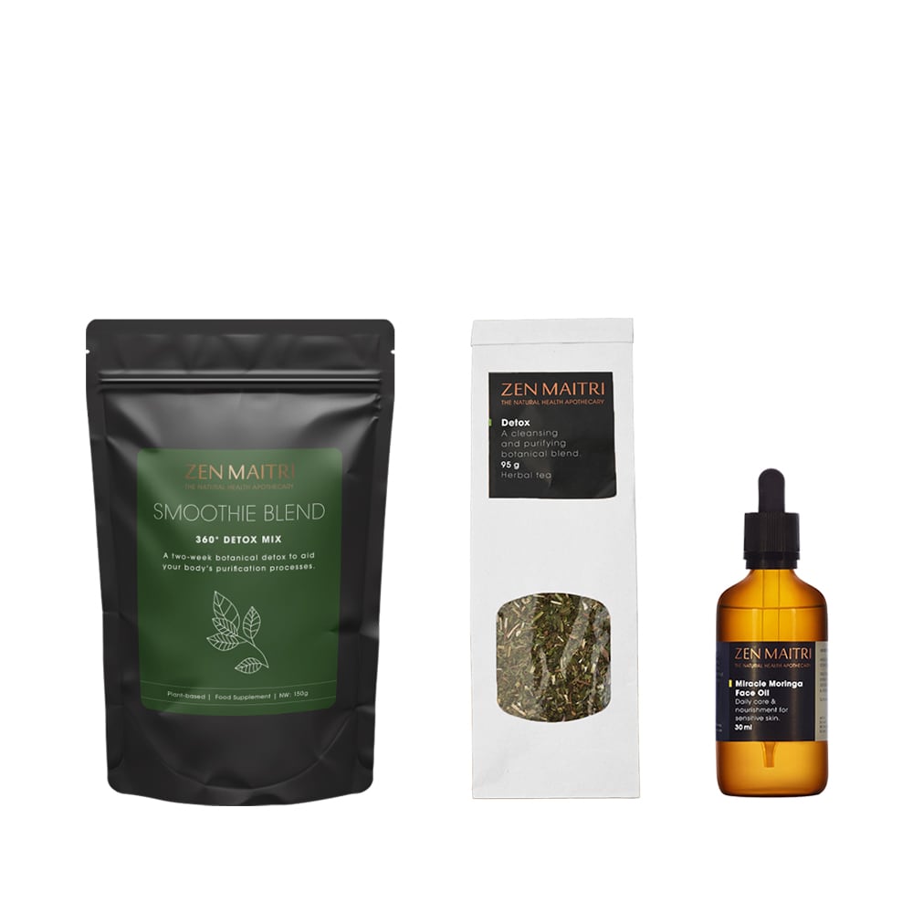 Contents: Miracle Moringa Face Oil (30ml), 360° Detox Mix (150g), Detox Tea (95g)