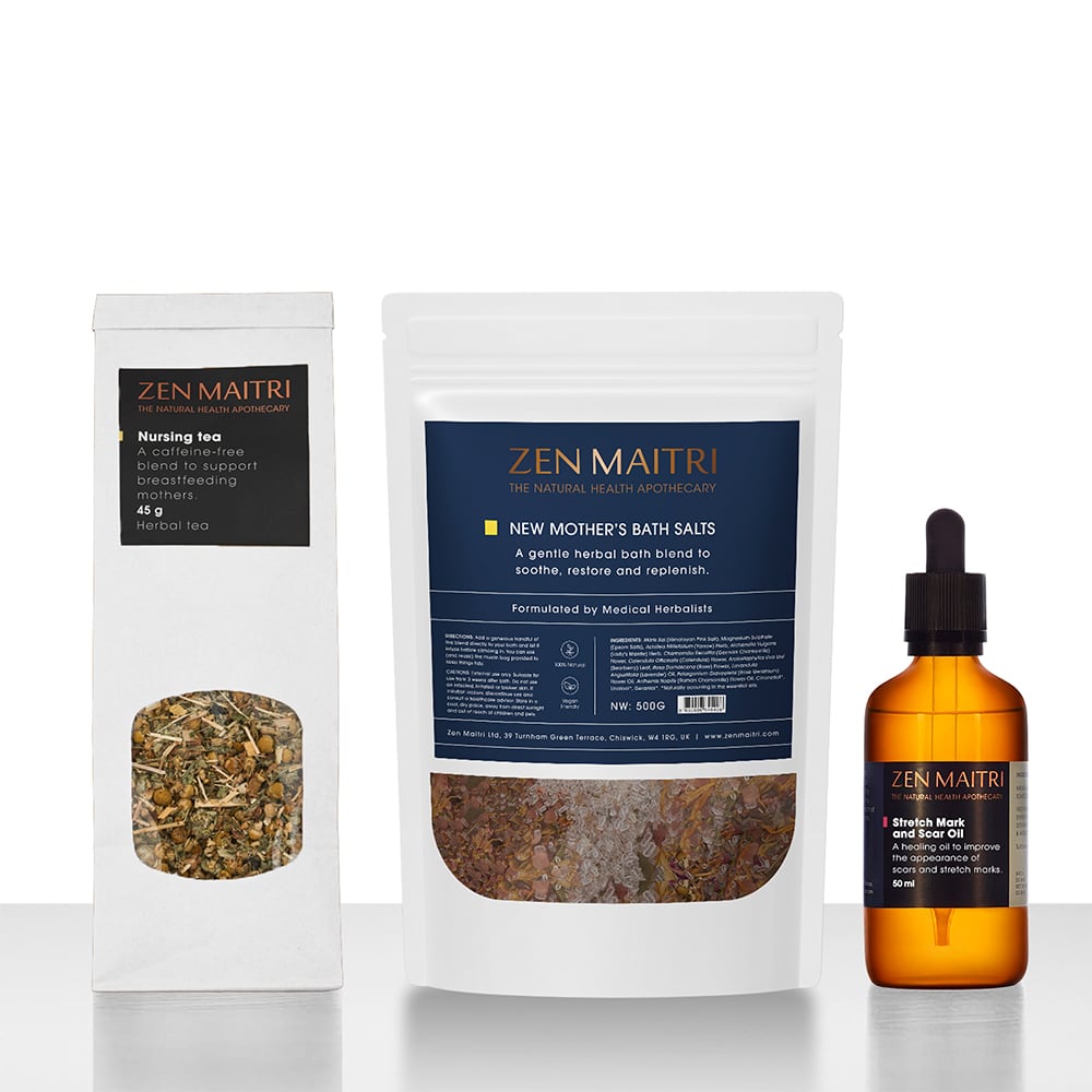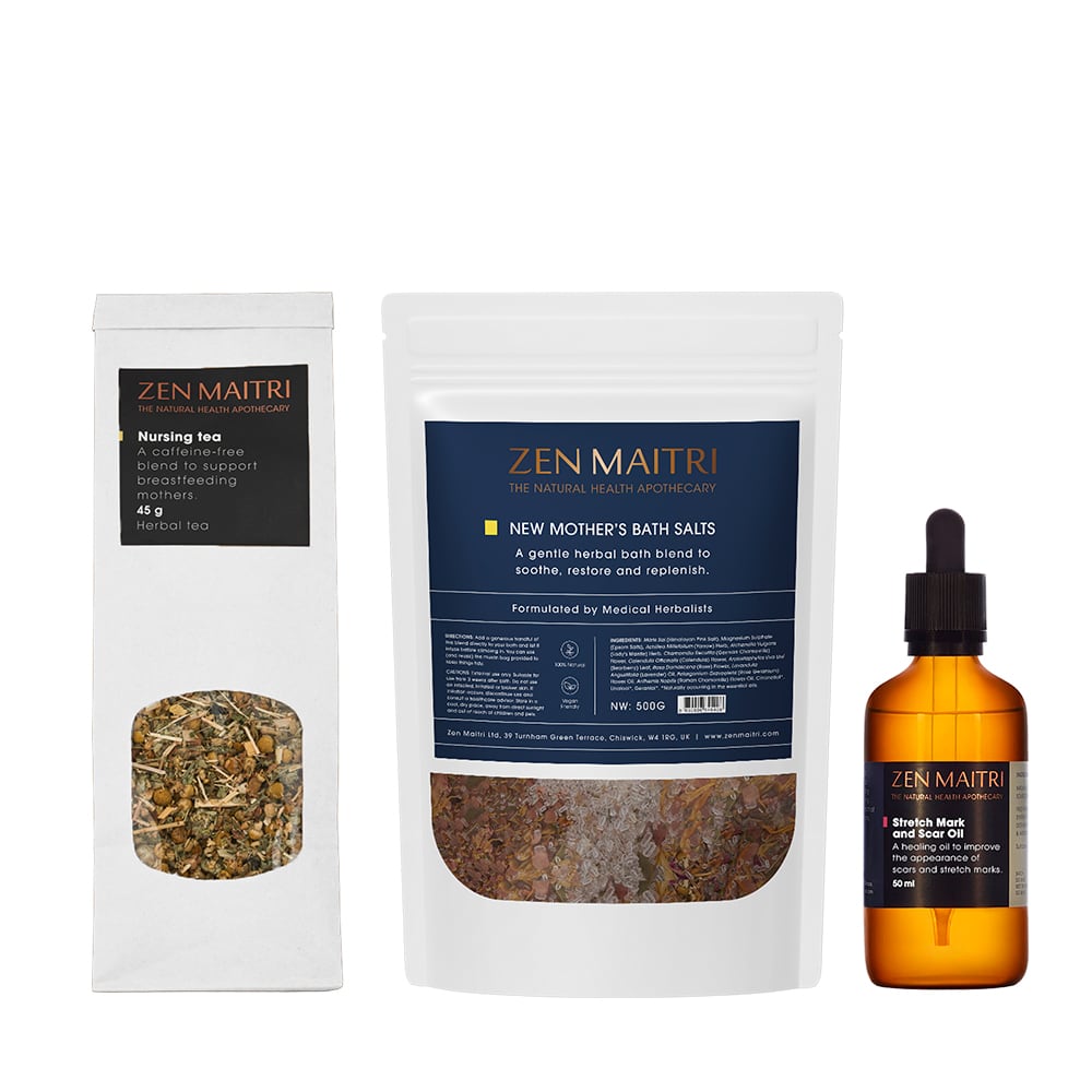 Contents: New Mother's Bath Salts (500g), Nursing Tea (45g), Stretch Mark & Scar Oil (50ml)
