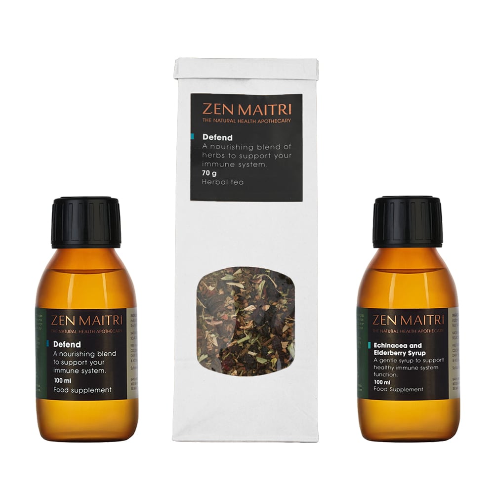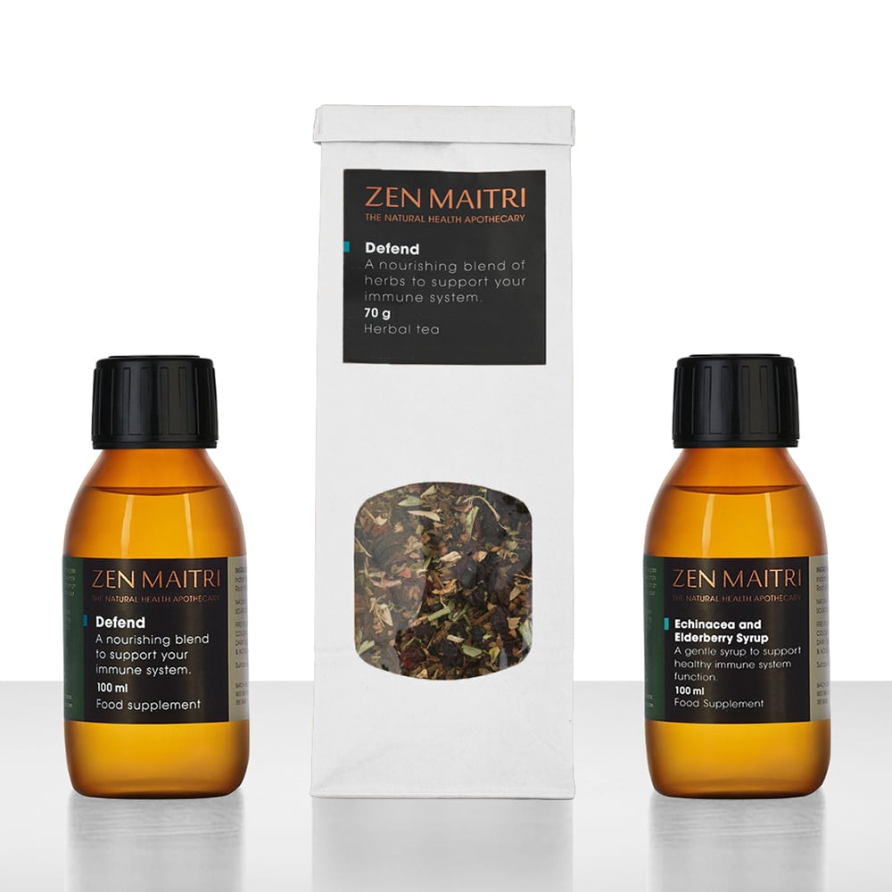 Contents: Echinacea & Elderberry Syrup (100ml), Defend Tea (70g), Defend Tincture (100ml)