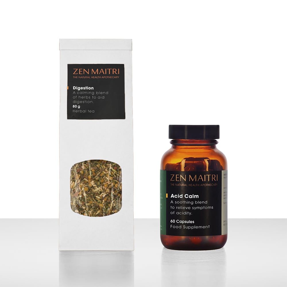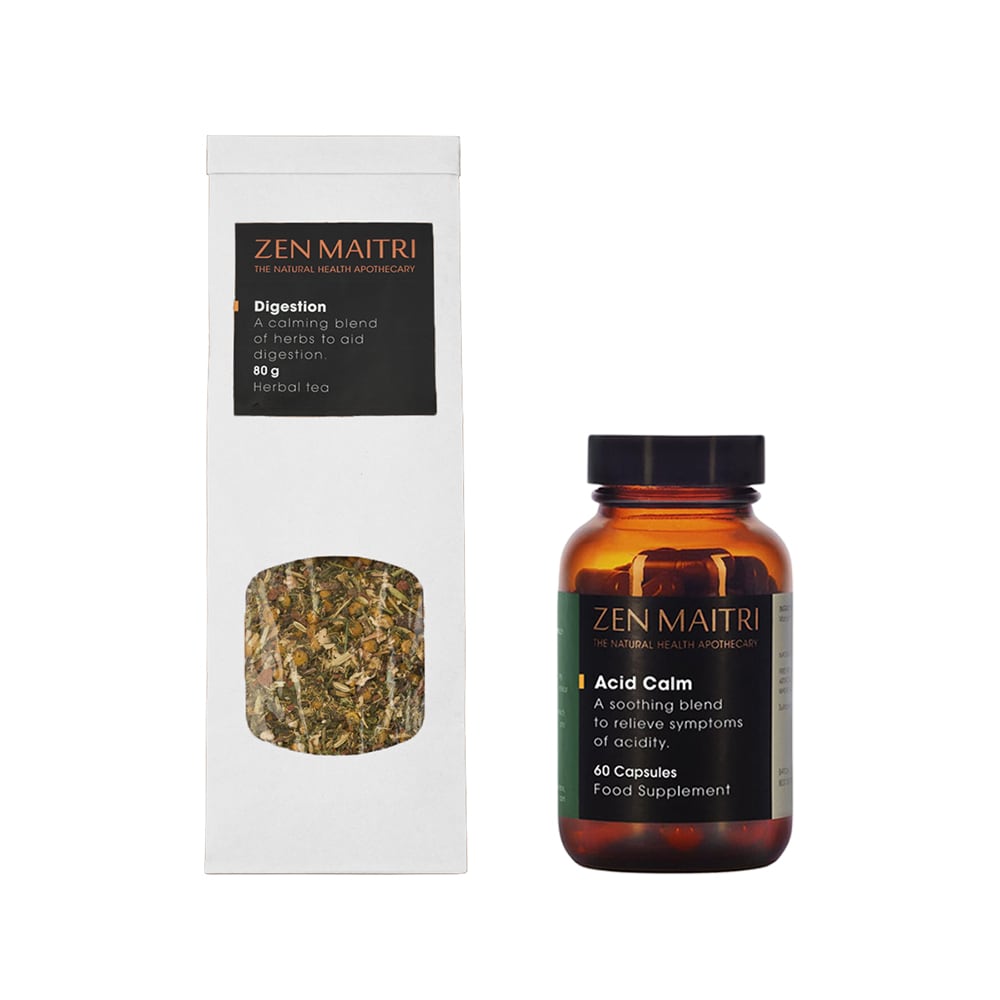 Contents: Acid Calm Supplements (60 Caps), Digestion Tea (80g)