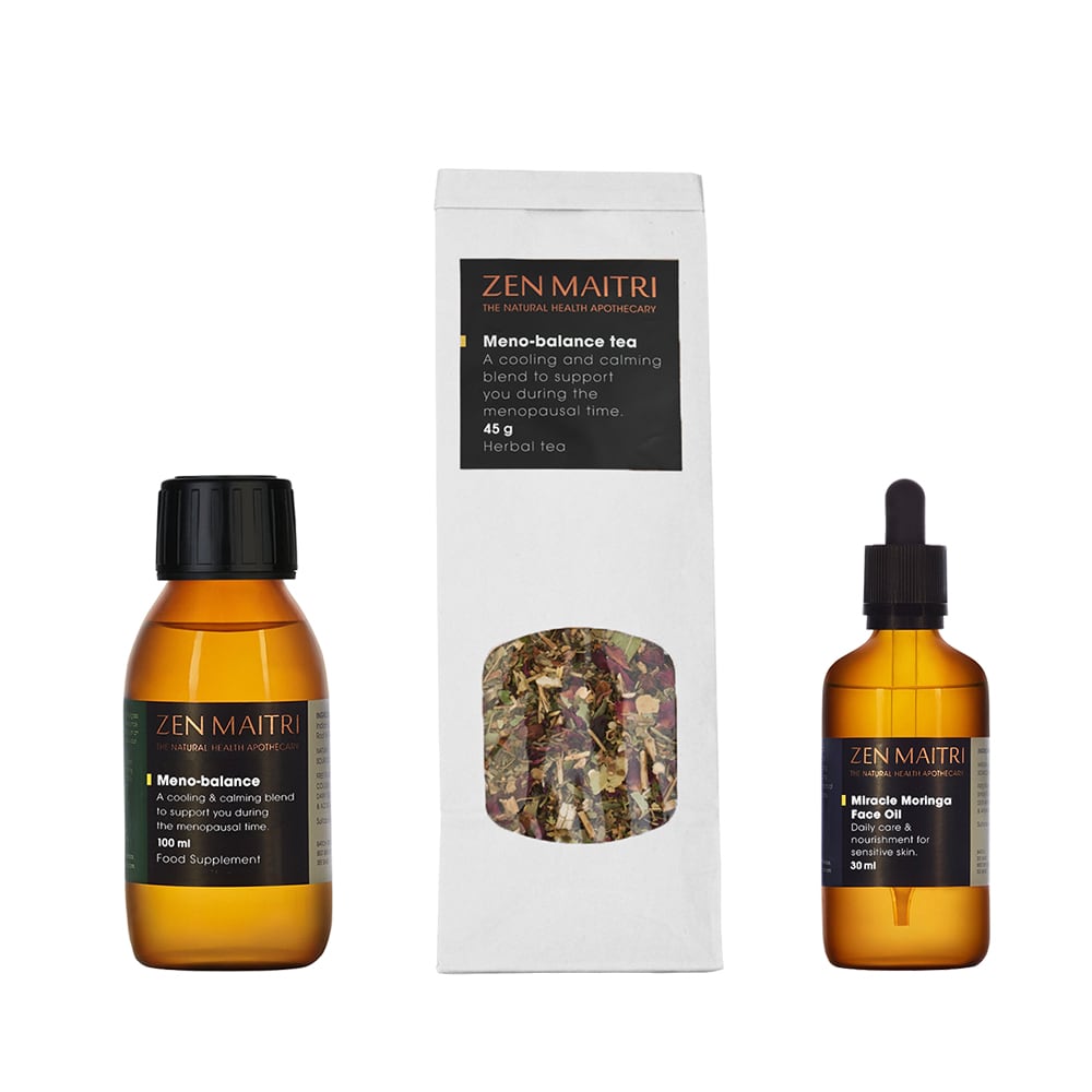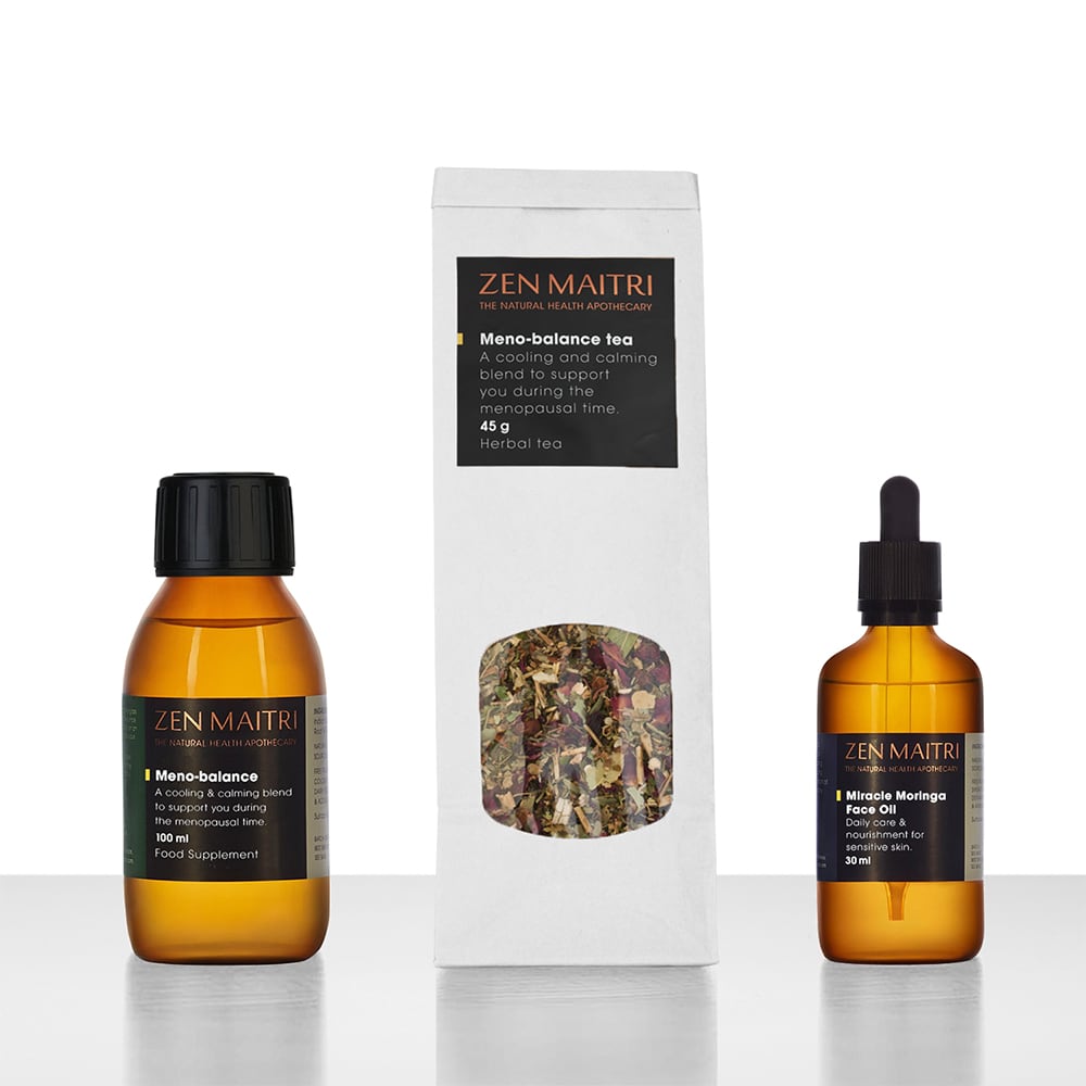 Contents: Miracle Moringa Face Oil (30ml), Meno-balance Tea (45g), Meno-balance Tincture (100ml)