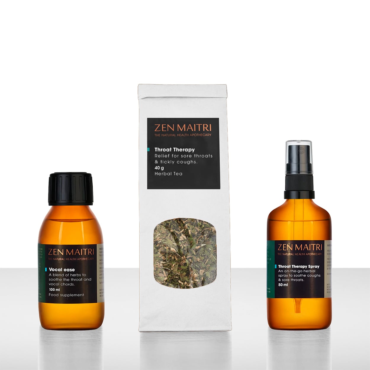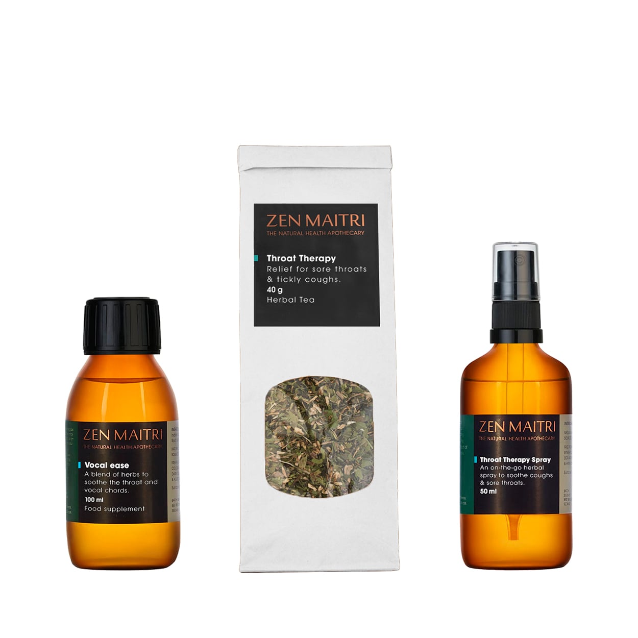 Contents: Throat Therapy Tea (40g), Vocal Ease Tincture (100ml), Throat Therapy Spray (50ml)